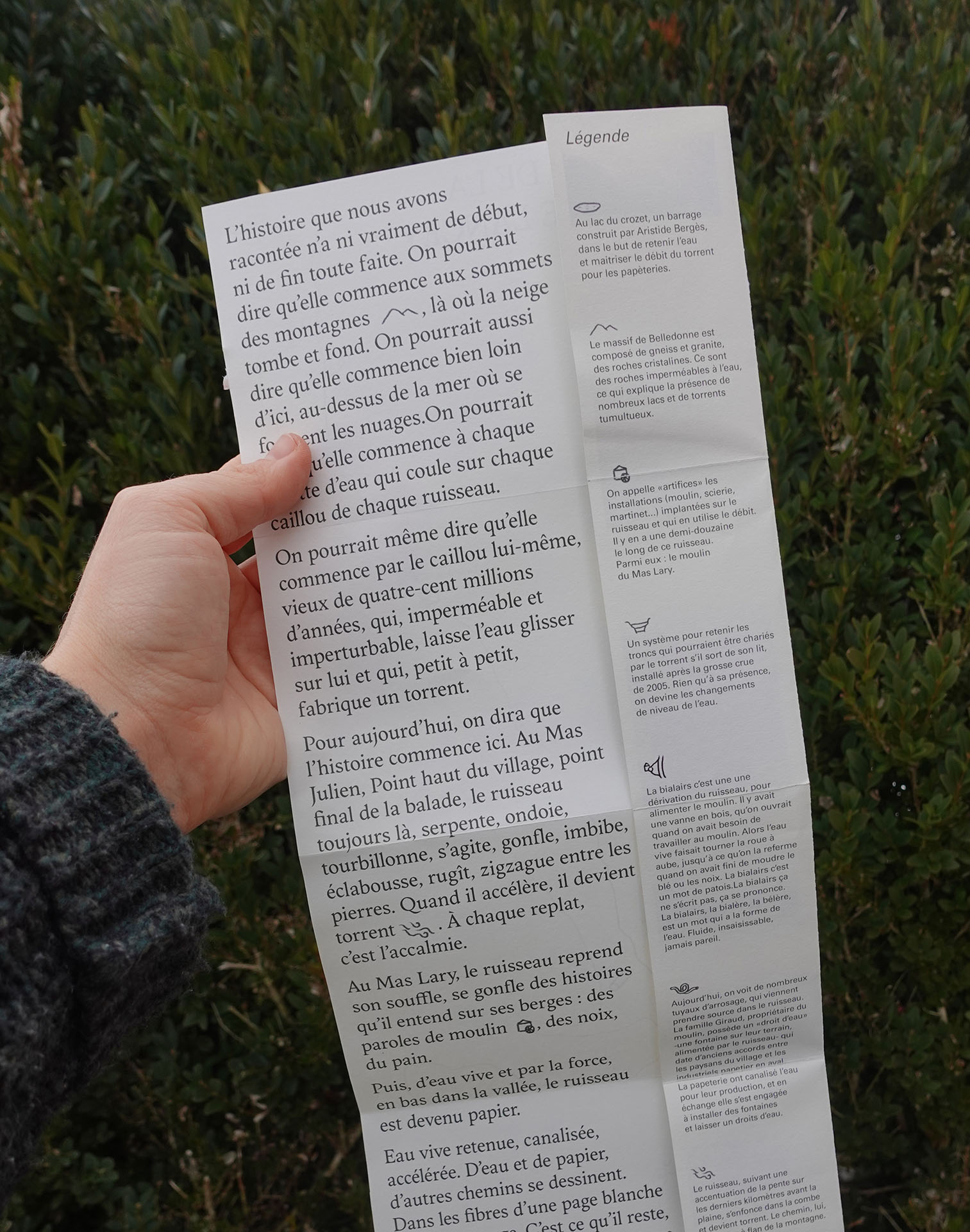 Une première balade, consacrée aux vestiges de l’industrie papetière, s’appuie sur des outils narratifs déployés à quatre points du paysage. En remontant les cours d’eau, le projet fait sortir les archives des tiroirs pour les remettre en résonance avec le paysage contemporain.