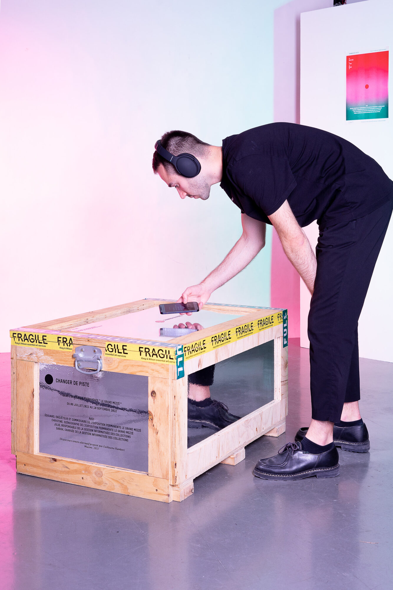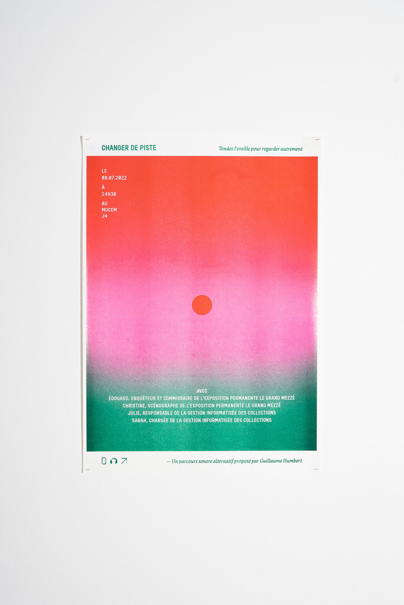 Voir un objet exposé au musée, est-ce uniquement le comprendre par ce qui est écrit sur son cartel ? Changer de piste est un parcours sonore et immersif entre ordinaire et extraordinaire, proposé au public dans l’espace du musée. Le contenu s’extrait des narrations classiques par le regard, la main et la voix de celles et ceux qui œuvrent dans l’ombre des objets. Le projet explore un principe à la croisée de la scénographie, de la dramaturgie et de la polyphonie où une forme alternative et plus universelle de culture matérielle est possible.