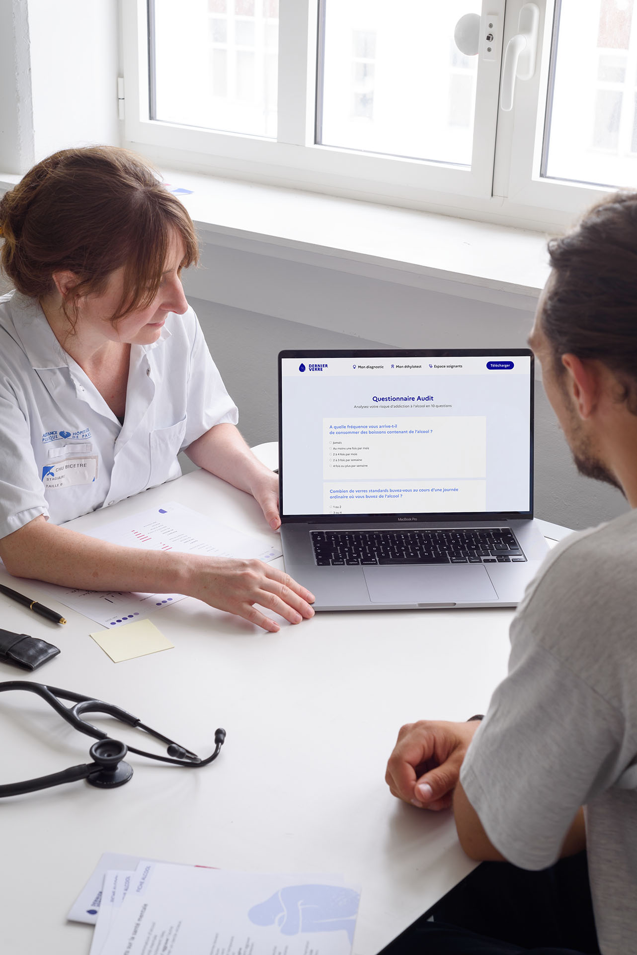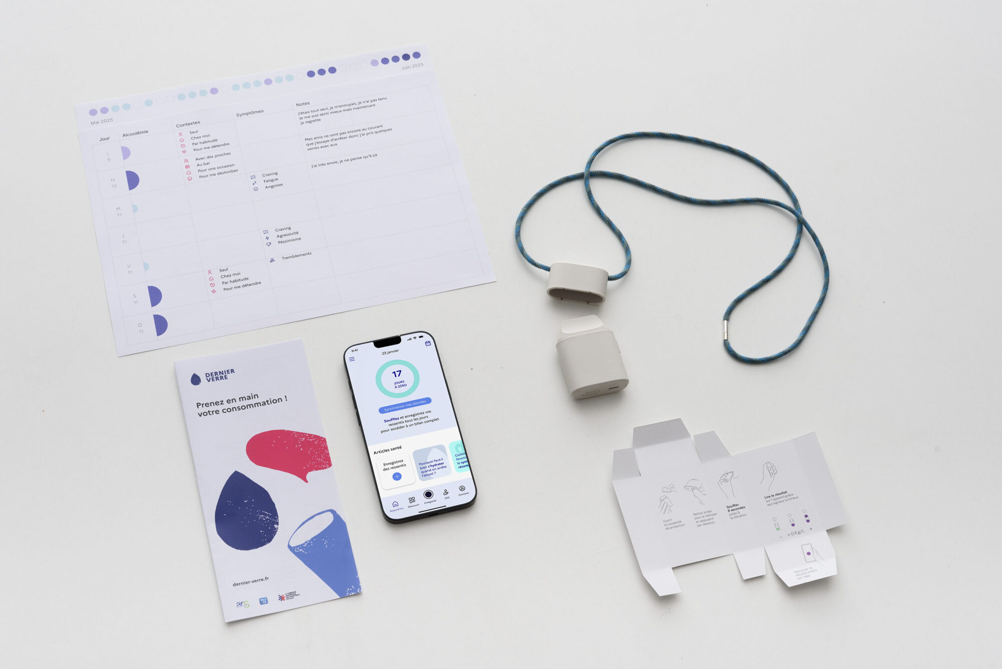 A l’issue d’une immersion dans un service d’addictologie, le projet prend la forme d’un dispositif de prévention et de soin. Une plateforme permet de centraliser les contenus d’information, tandis qu’une application de suivi et un éthylotest connecté, repensé pour un usage thérapeutique, offrent la possibilité d’un accompagnement quotidien. L’objectif de ces outils est de repenser le rapport à l’alcool, soutenir les moments difficiles et replacer la personne au centre de son parcours de soin.