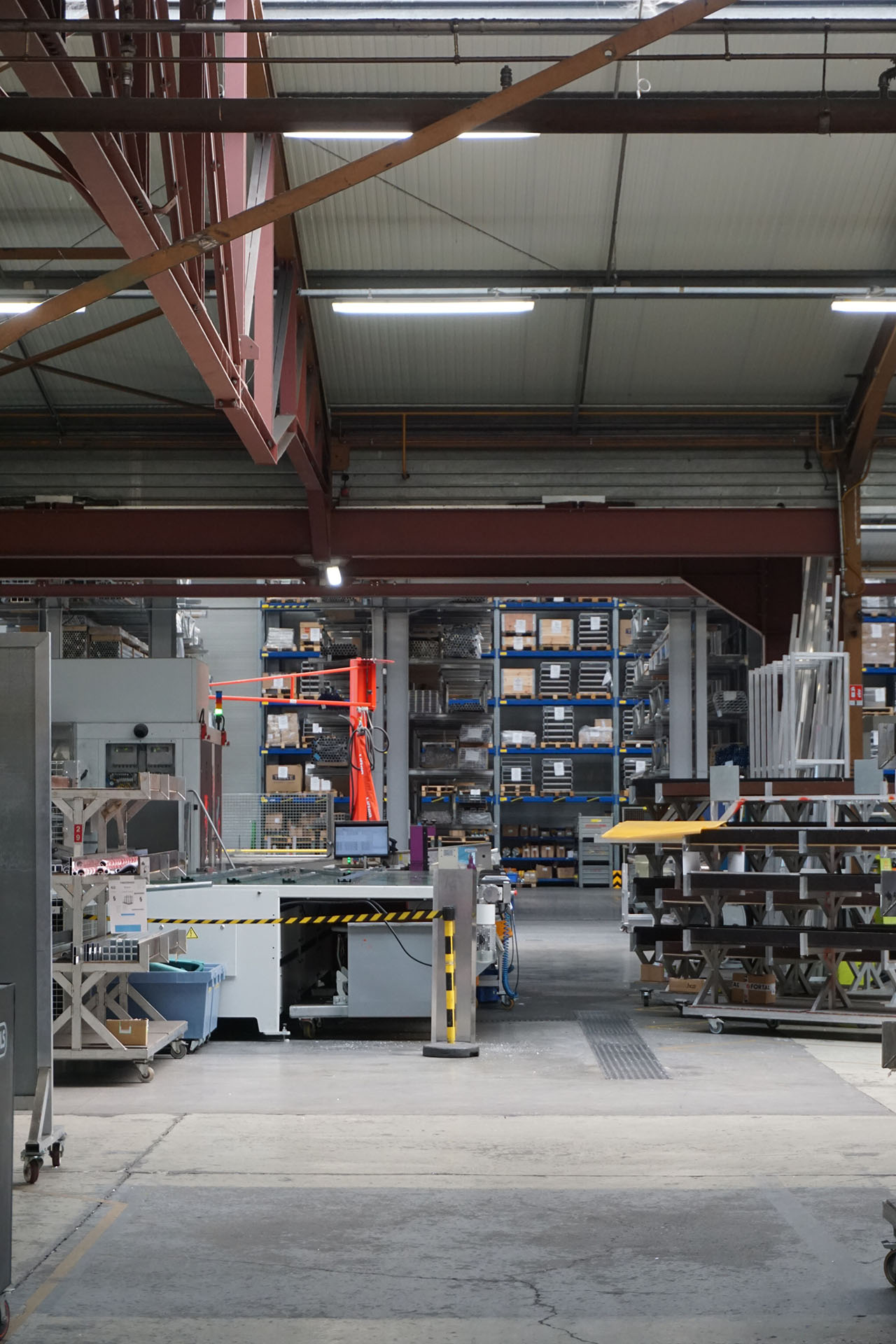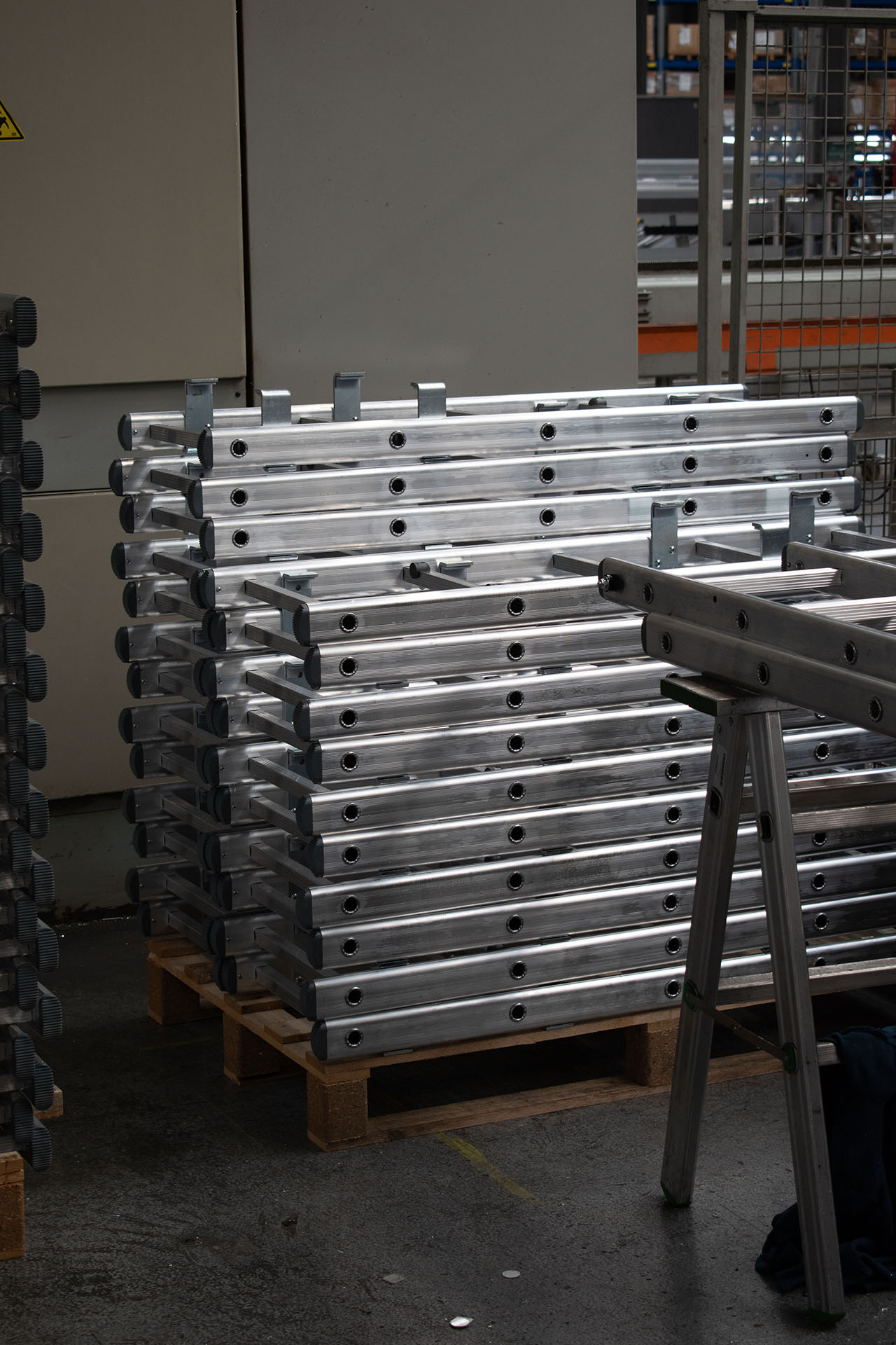 Porté par mon intérêt pour les processus d’assemblages industriels et les qualités formelles des détails de fabrication fonctionnels, « Échelle 1 » se focalise sur le sertissage des barreaux d’échelles. Cette technique permet de fixer des profils creux sans quincaillerie. Pour révéler ce savoir-faire industriel et en tirer parti, une collaboration s’initie avec Fortal, entreprise alsacienne spécialisée dans la fabrication d’échelles. Conçu en immersion dans leurs ateliers, le projet donne naissance à des assises en aluminium.