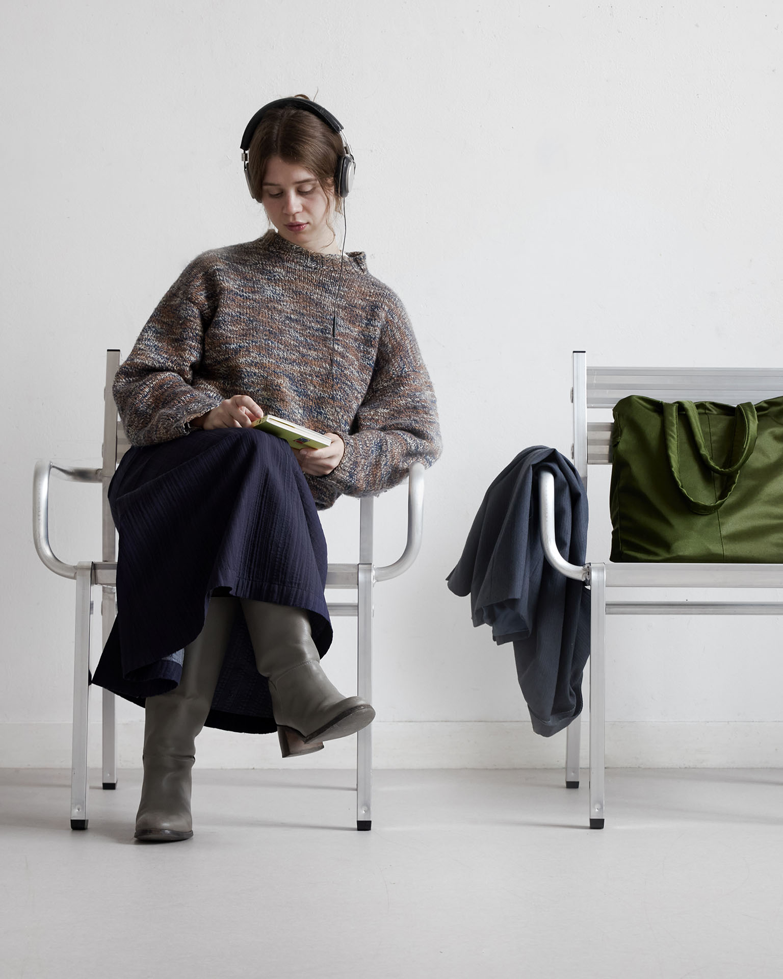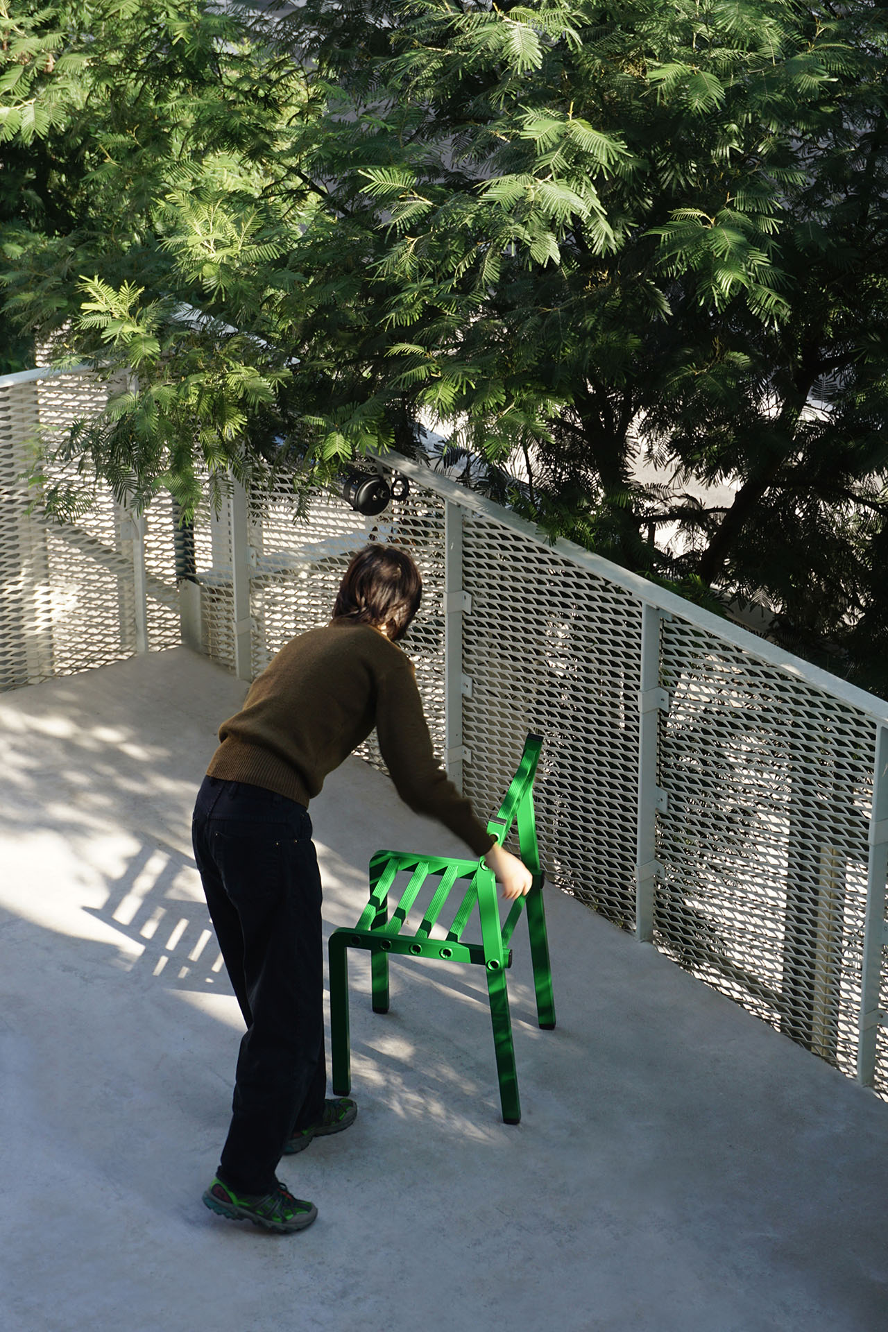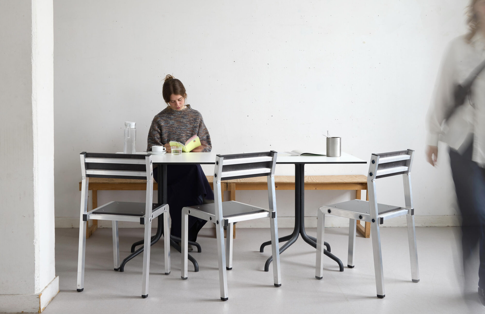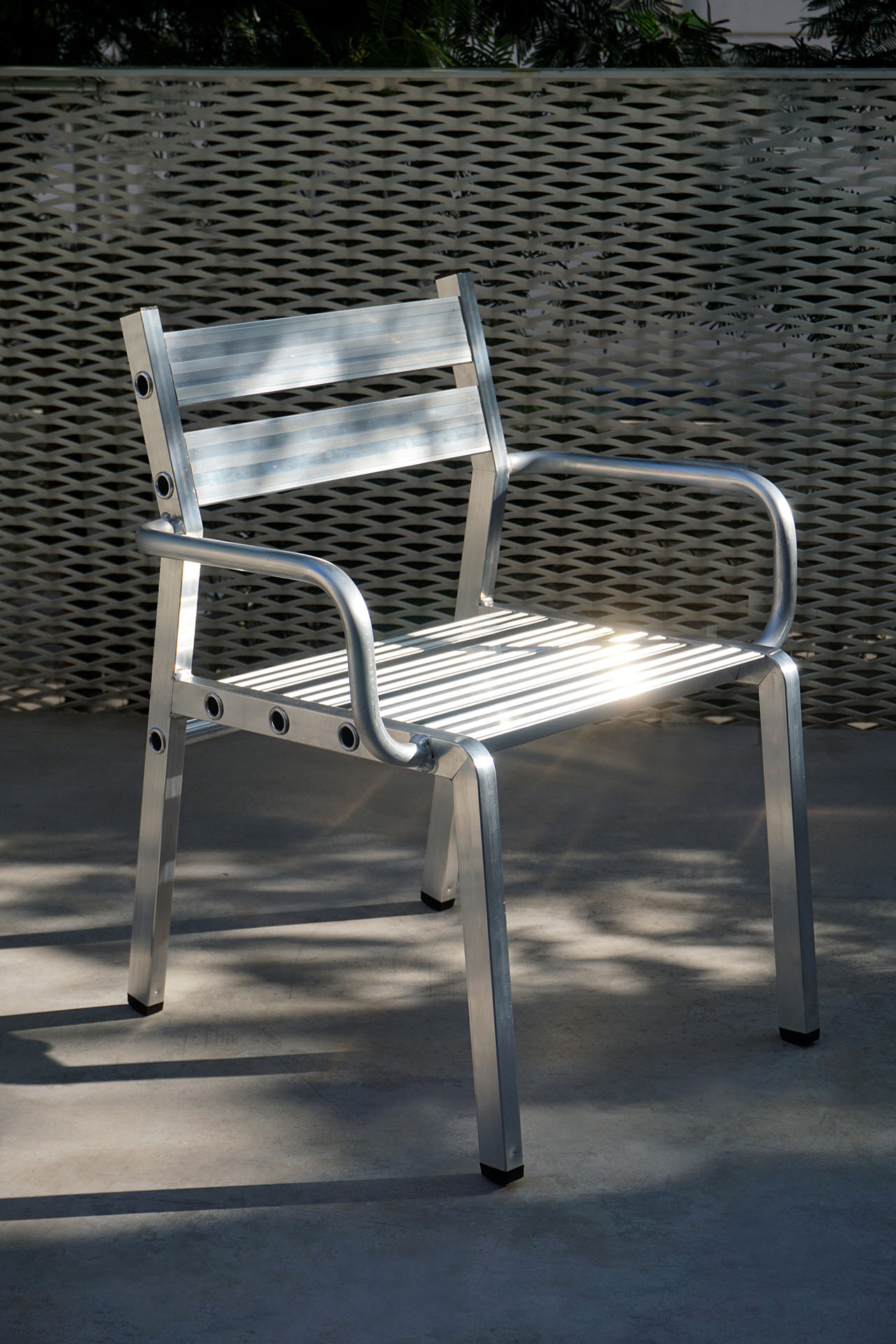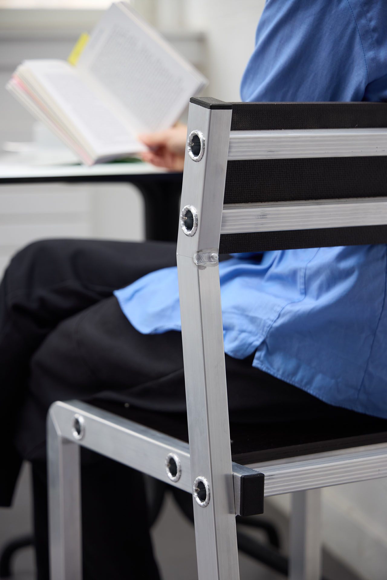 La chaise est légère et empilable, sa structure est complétée par du contreplaqué filmé – utilisé pour les échafaudages. Le fauteuil, dont l’assise et le dossier sont réalisés avec le profilé des marches d’escabeaux, est tout aluminium, adapté aux contraintes extérieures. La robustesse d’assemblages par sertissage, la légèreté de l’aluminium et la logique industrielle de production donnent des assises adaptées aux contraintes des collectivités.