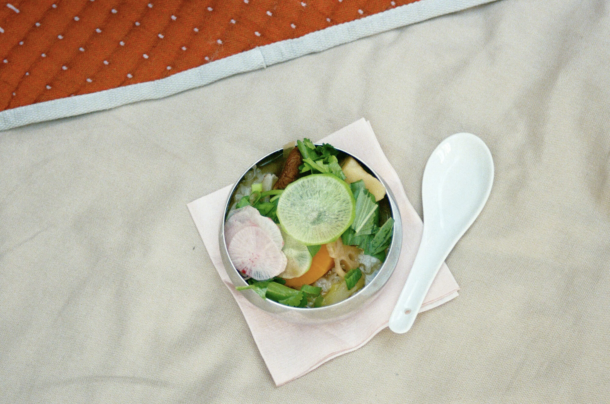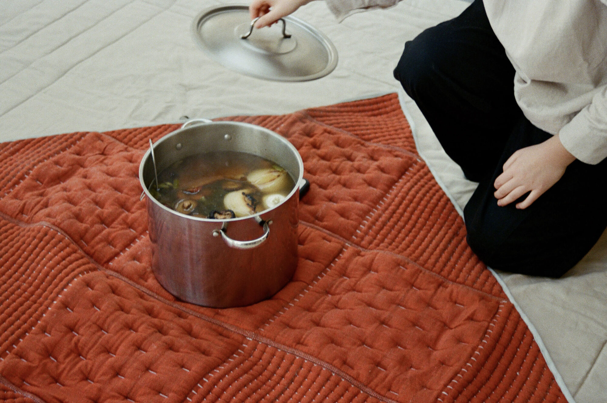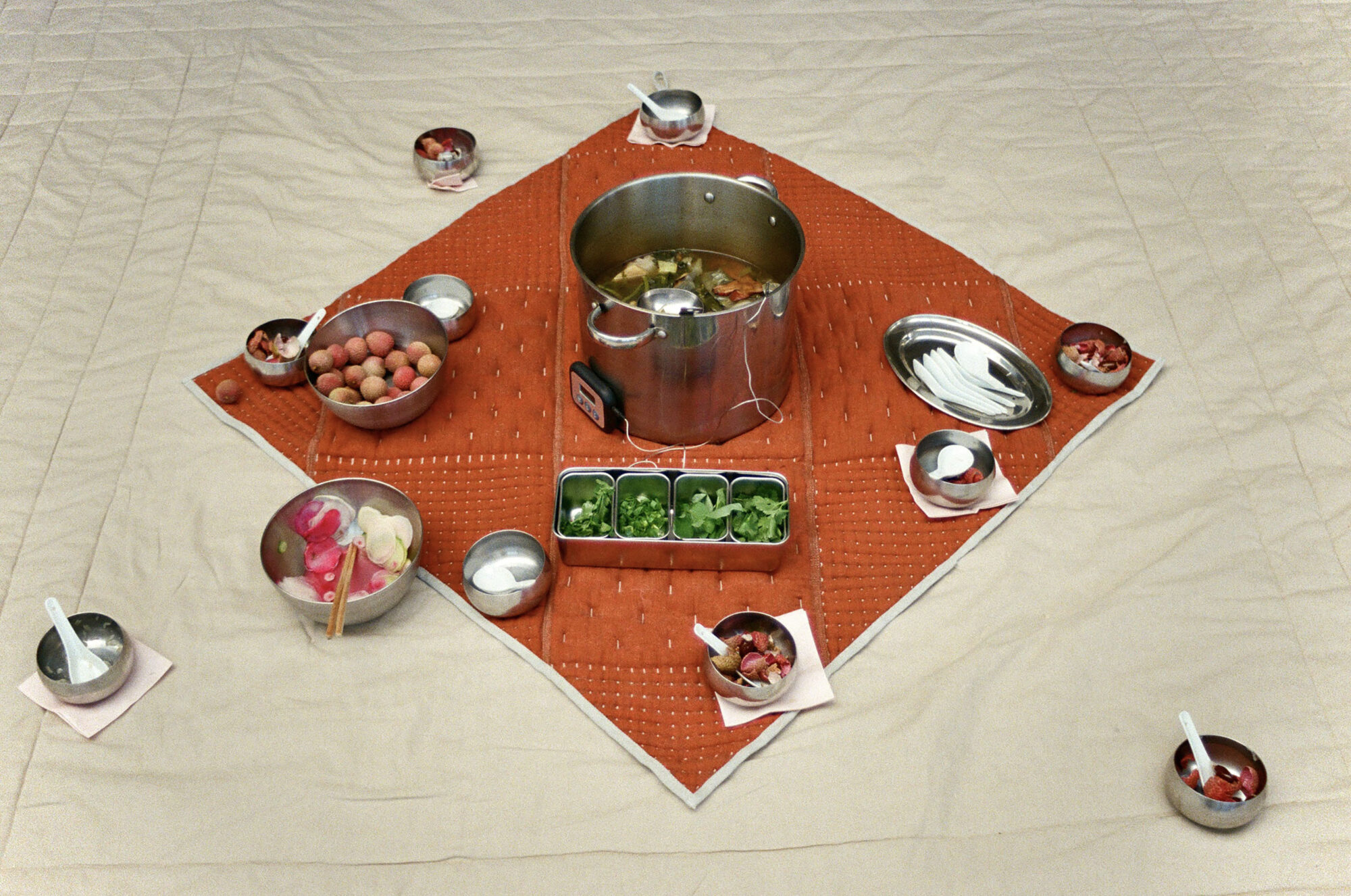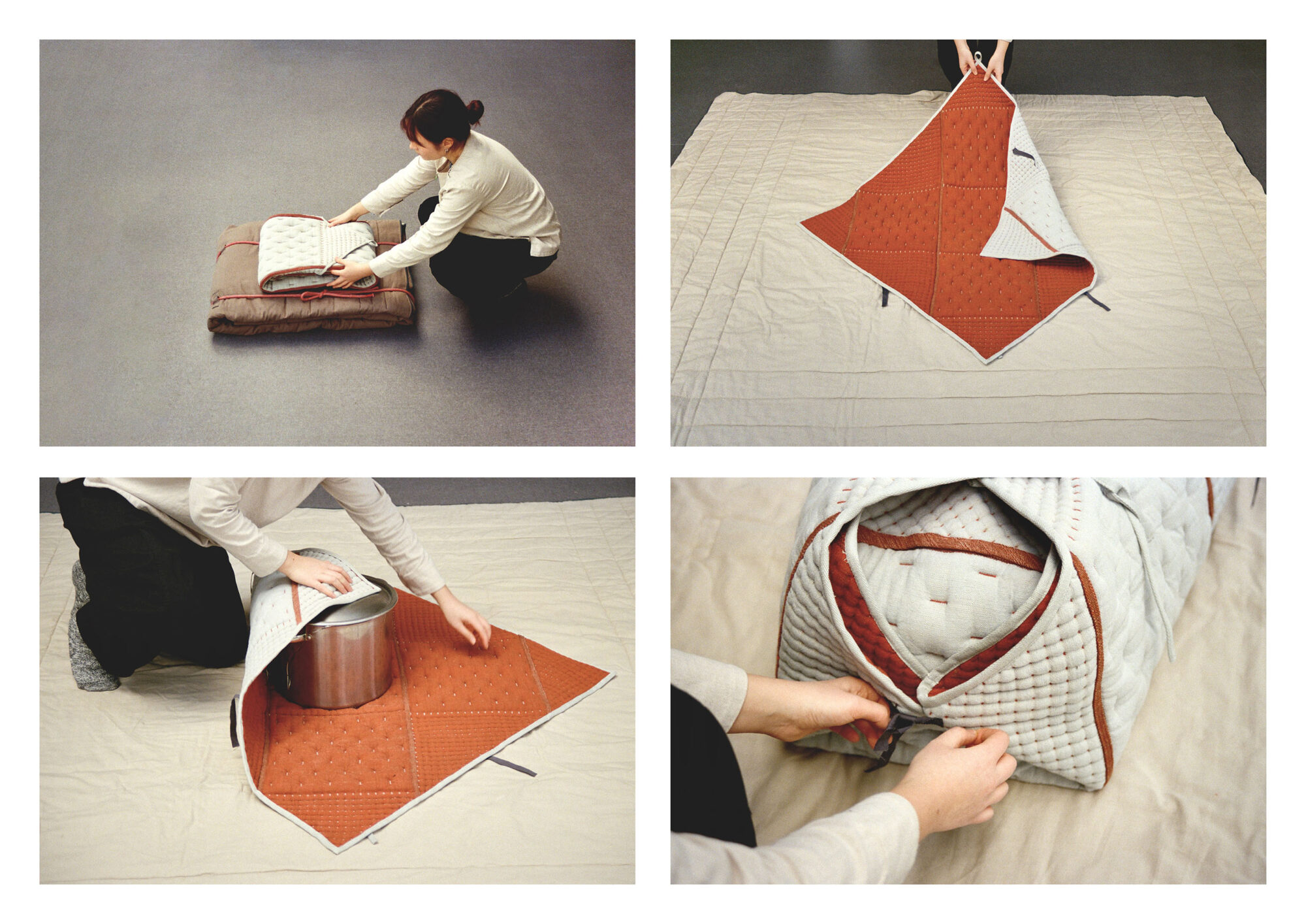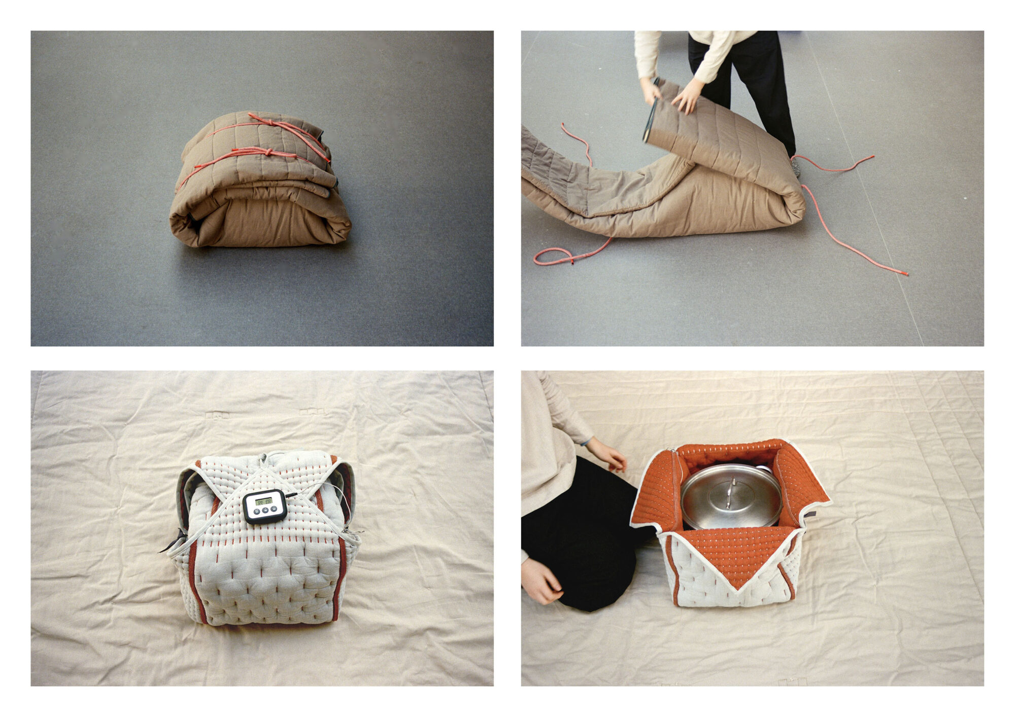 Aux origines du foyer, la chaleur rassemble. Une invitation à un repas cuisiné met en scène cette chaleur dans l’espace. Inspiré du principe de la marmite à isolation thermique, le repas est cuit puis enveloppé pour en conserver la température et poursuit lentement sa cuisson en hibernation. Une fois déployées, les enveloppes de laine diffusent la chaleur et dessinent au sol un foyer autour duquel se réunir.
