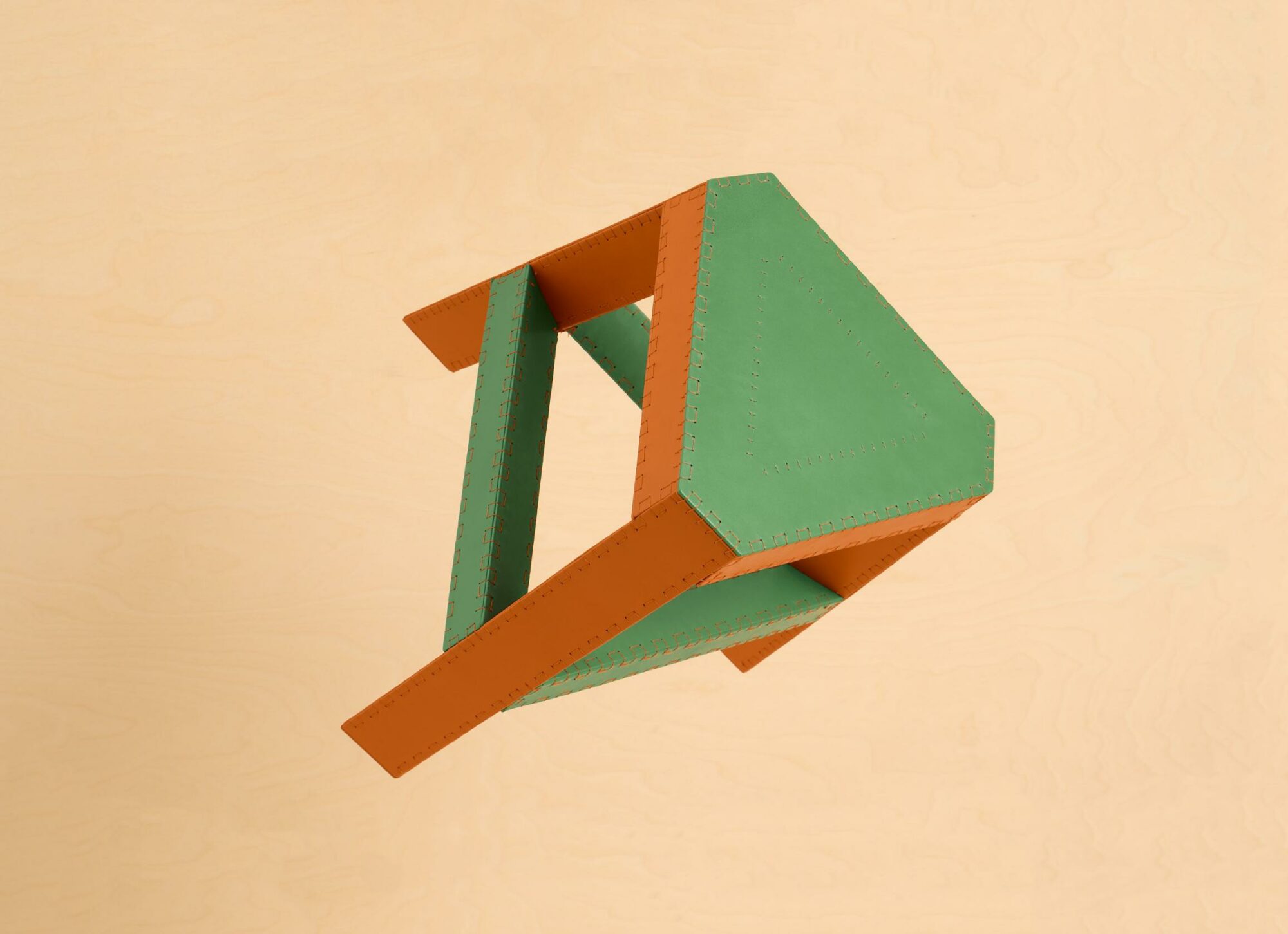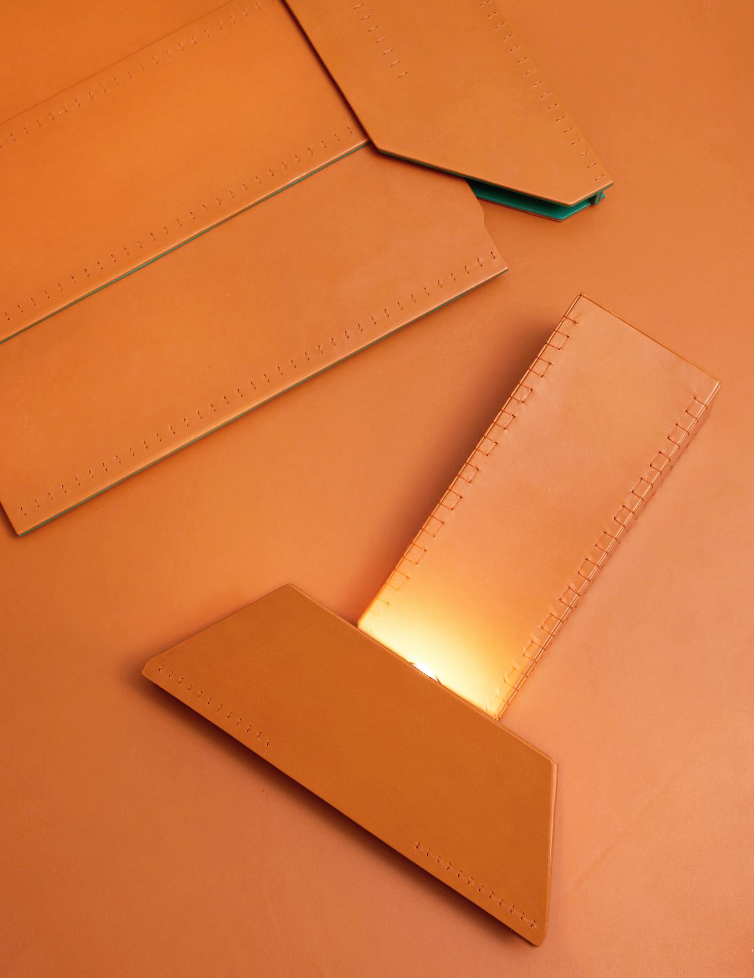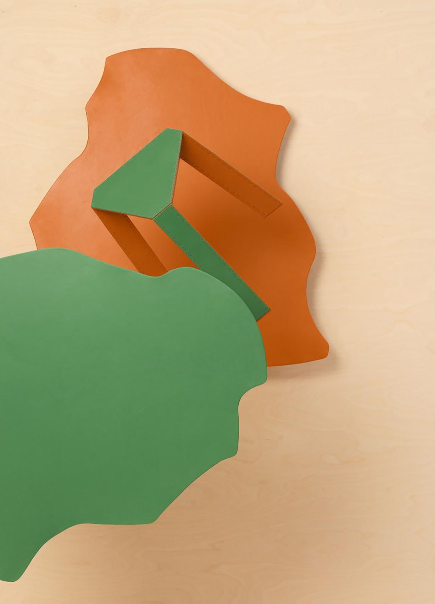 « Gainages » est une recherche sur les nouvelles techniques de gainage. Dans un but de légèreté, le cuir d’agneau gainé permet d’assembler, par couture, de minces panneaux de contreplaqué aviation, créant ainsi des objets pesant à peine 680 grammes.
