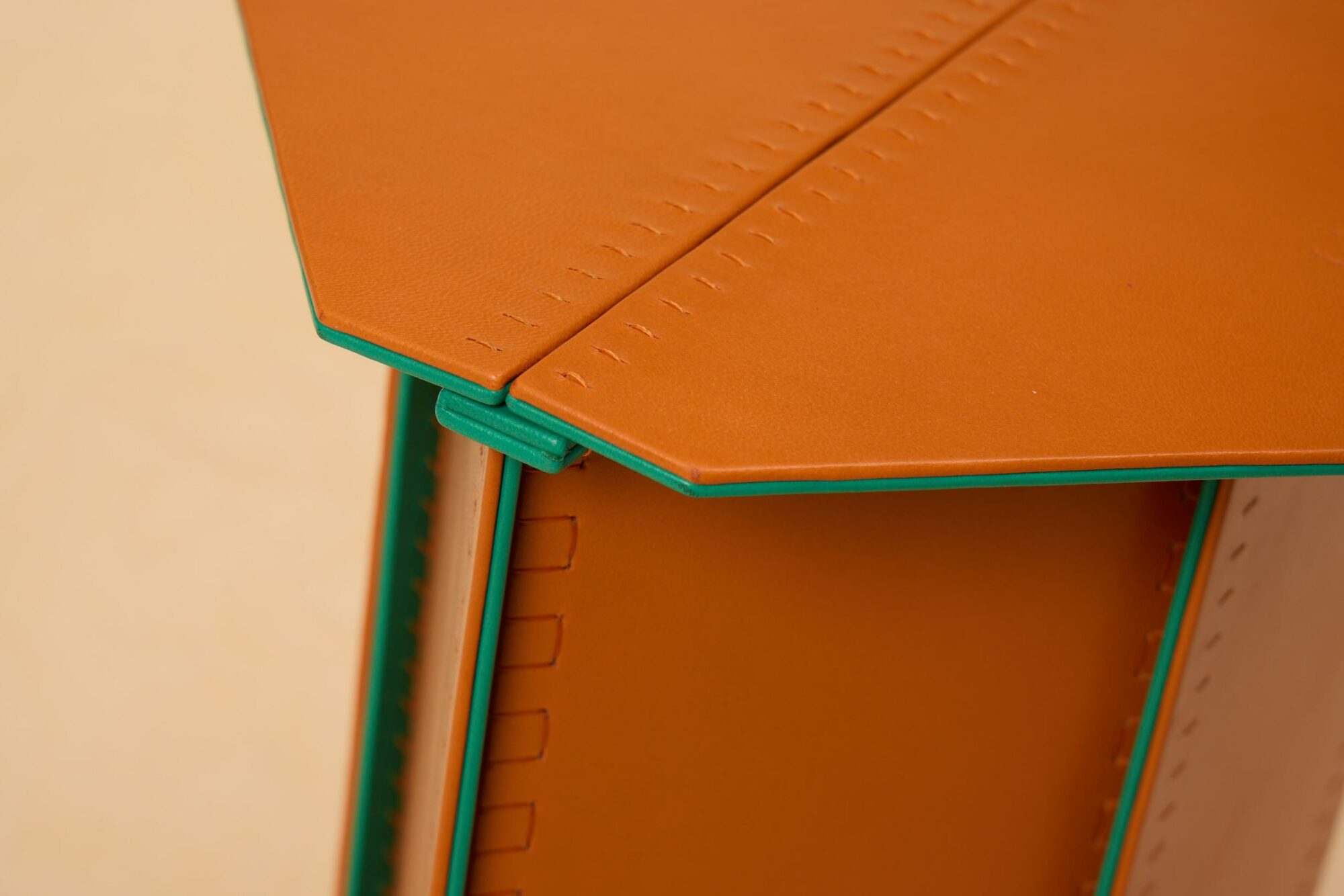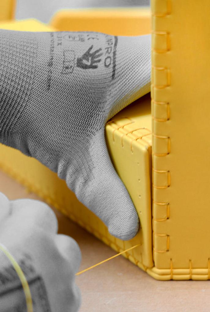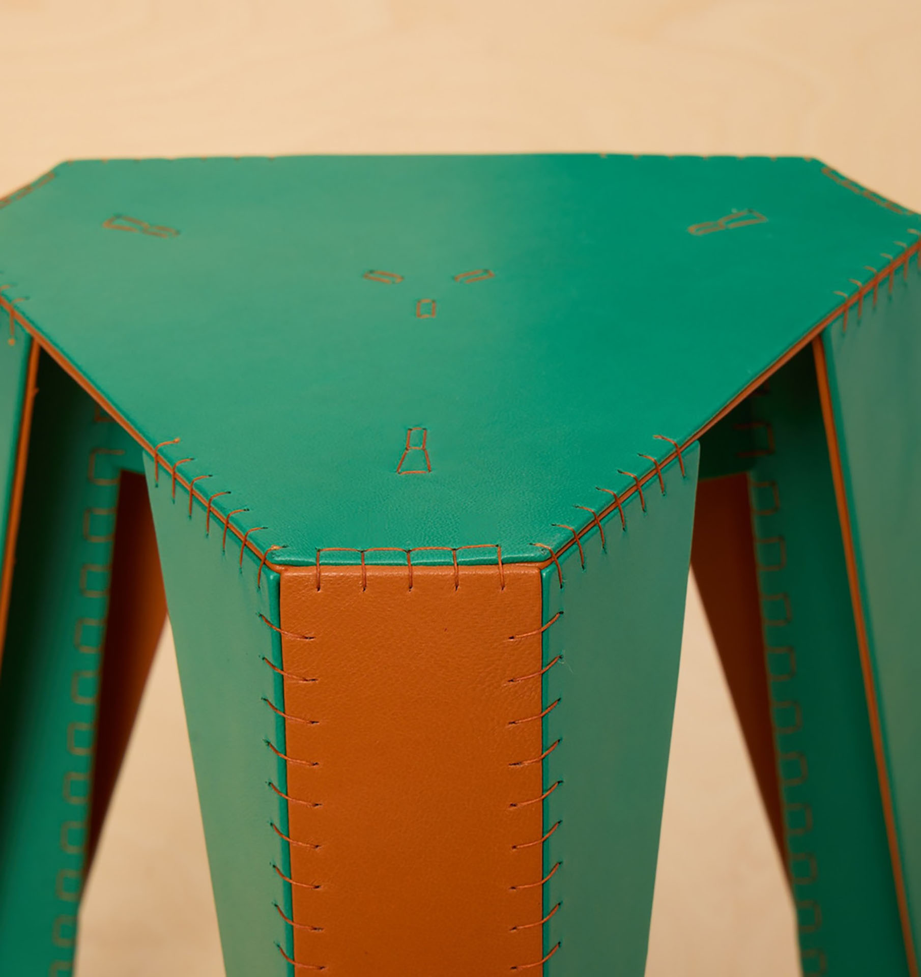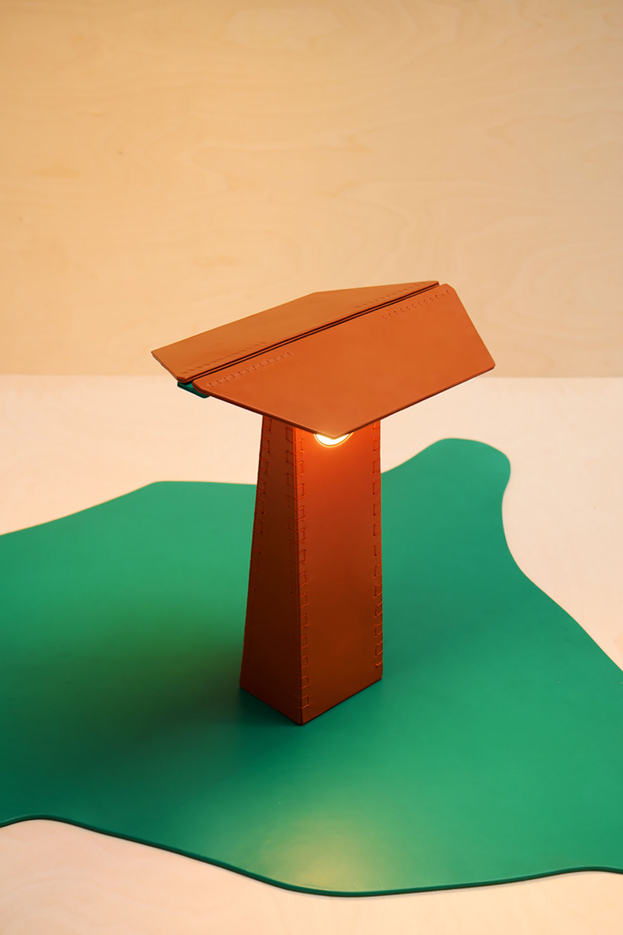 « Gainages » est une recherche sur les nouvelles techniques de gainage. Dans un but de légèreté, le cuir d’agneau gainé permet d’assembler, par couture, de minces panneaux de contreplaqué aviation, créant ainsi des objets pesant à peine 680 grammes.