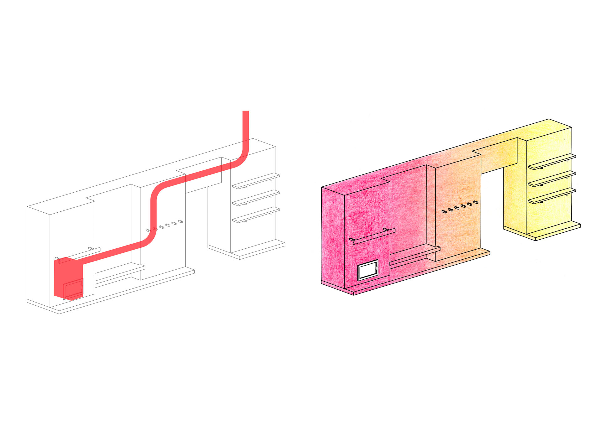 Comment mieux utiliser la chaleur du poêle de masse, mieux la répartir et la diffuser pour en faire un meilleur usage ? Afin d’imaginer d’autres manières d’habiter, plus simple, plus douce et plus lisible, tout en économisant l’énergie, Point chaud imagine des éléments architecturaux en pisé qui se déploient à l’intérieur de la maison pour créer des zones de chaleur qui donnent lieu à des nouveaux scénarios de vie.